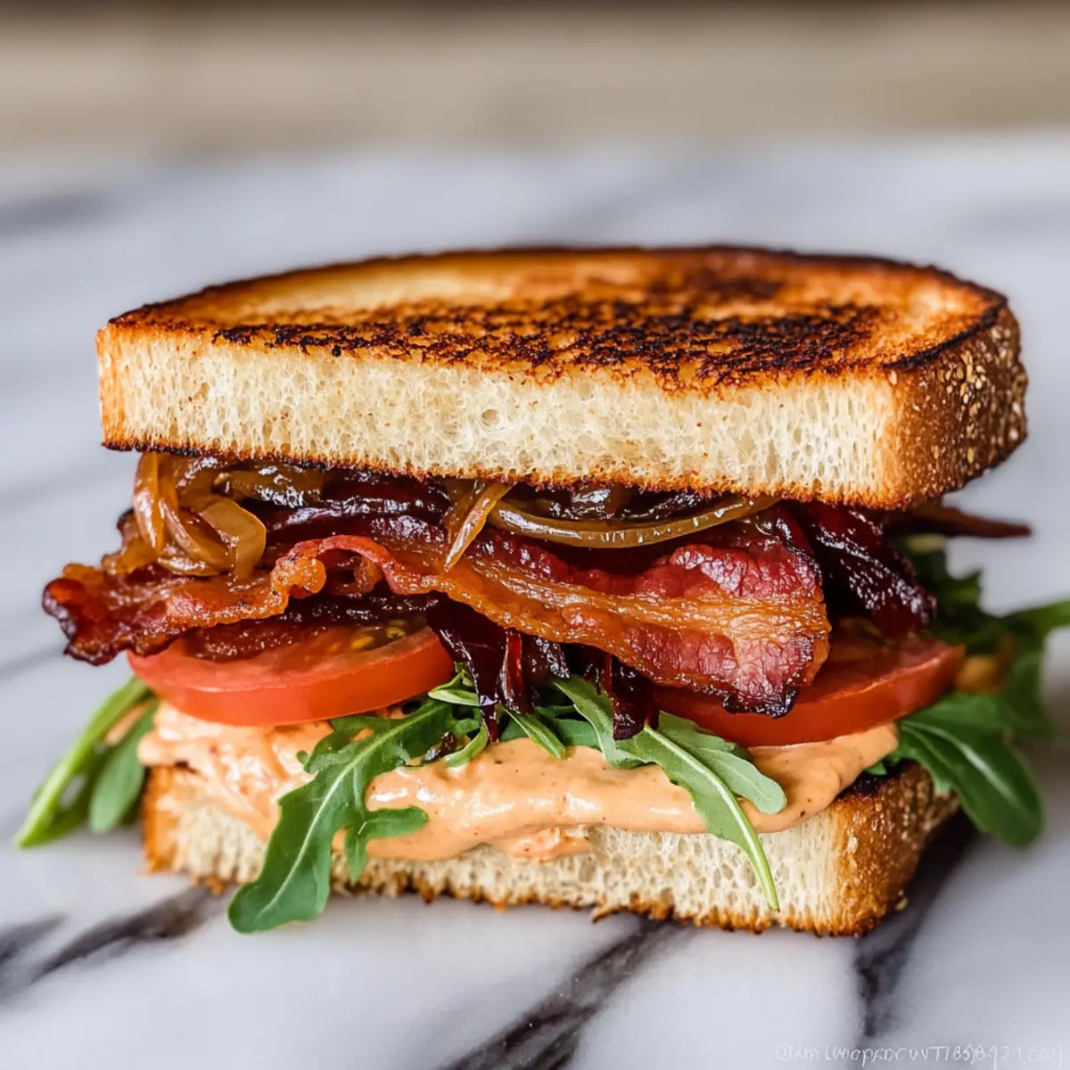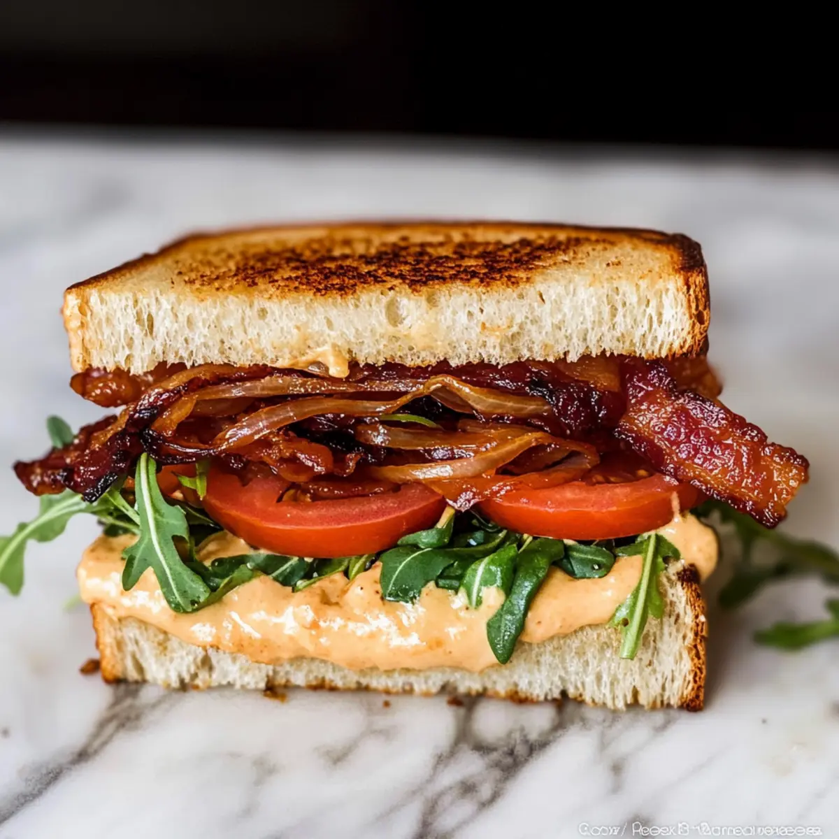 - Assemble the Sandwich: Spread chipotle mayo on one side of each slice. Layer caramelized onions, bacon, tomato, and arugula on one slice, then top with the other slice.