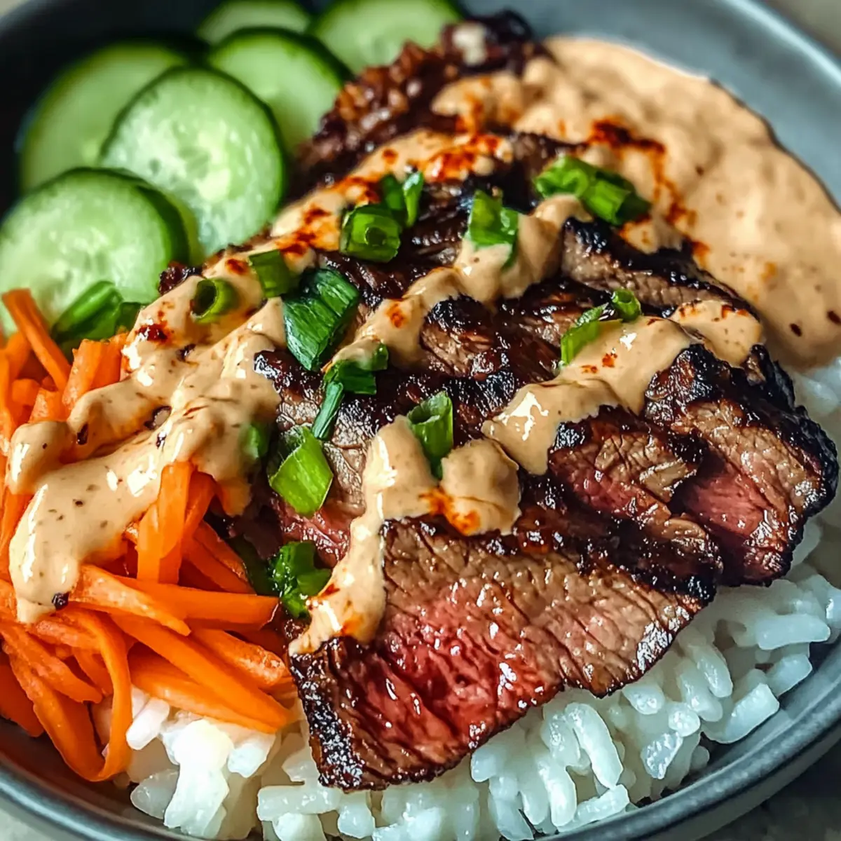 Delicious Korean BBQ Steak Rice Bowls with Spicy Cream Sauce