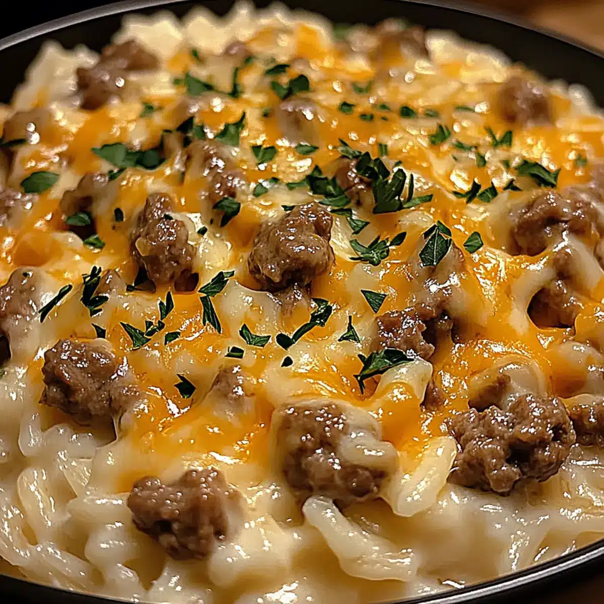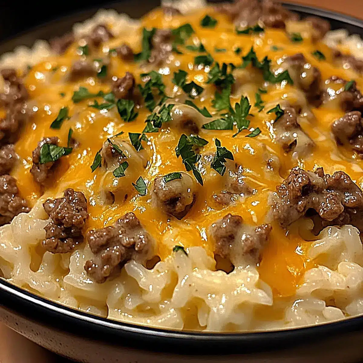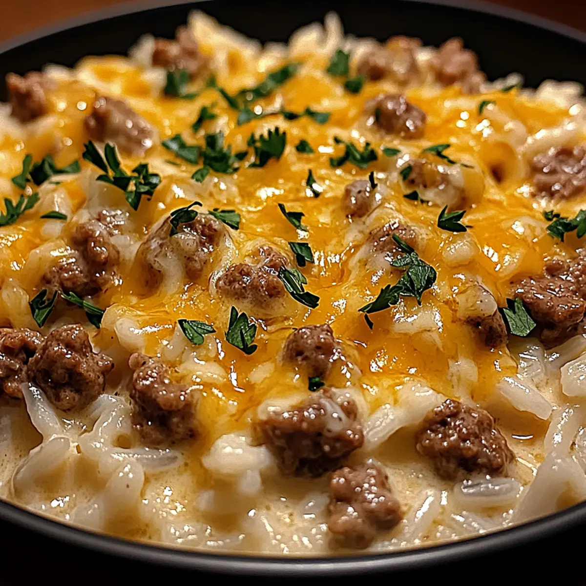 Once the rice is cooked, gently pour the creamy cheese sauce into the skillet with the beef and rice mixture. Stir well to combine everything, ensuring the beef and rice are perfectly coated in the luscious sauce. Let it cook uncovered for an additional 2-3 minutes, allowing the flavors to meld beautifully in your Cozy Garlic Butter Beef Bowl.