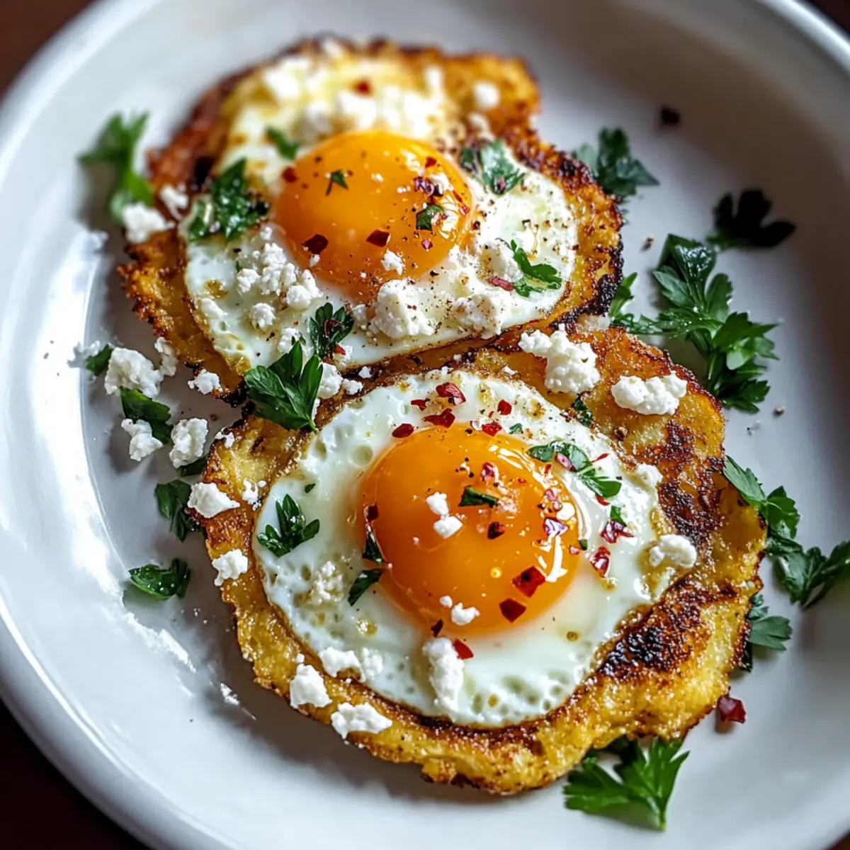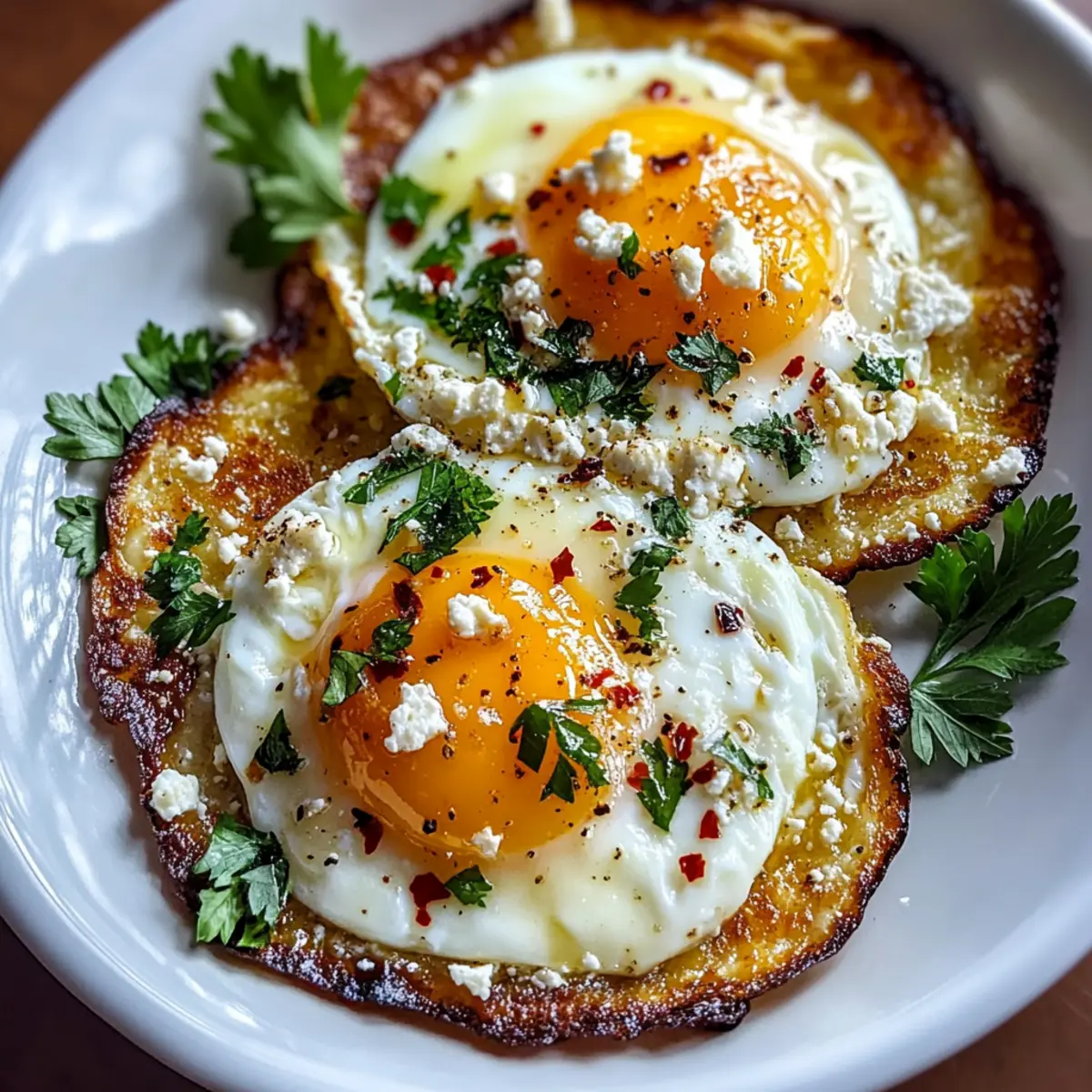 If desired, sprinkle freshly chopped parsley and a pinch of red pepper flakes on top of the eggs for a touch of color and a hint of spice. Gently slide the eggs and crispy feta onto a plate. Serve immediately, allowing everyone to enjoy the delightful combination of textures and flavors in your Crispy Feta Fried Eggs.