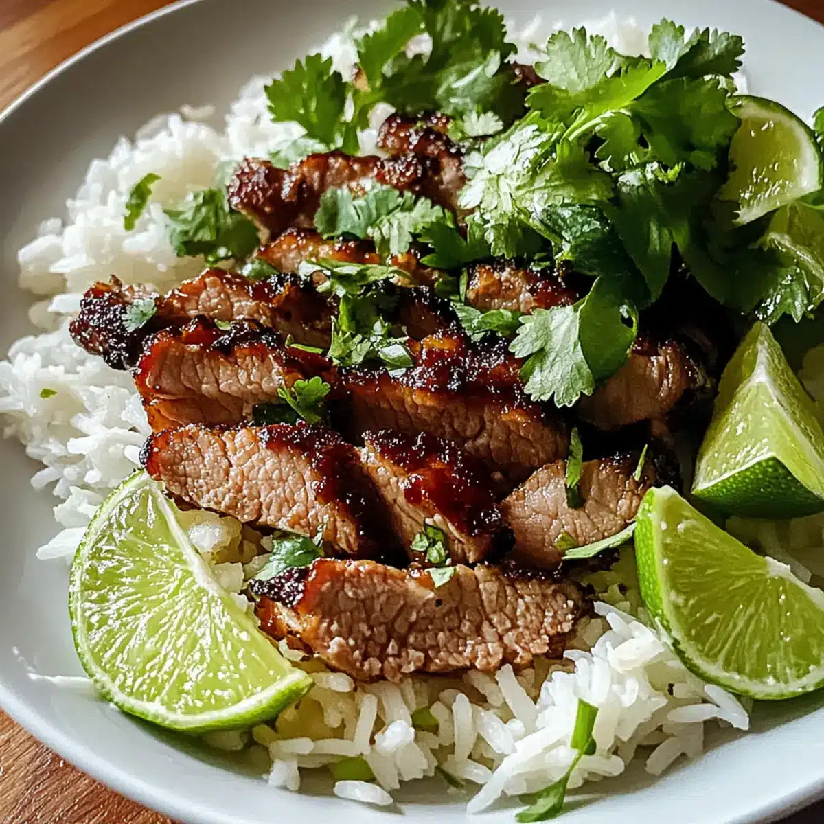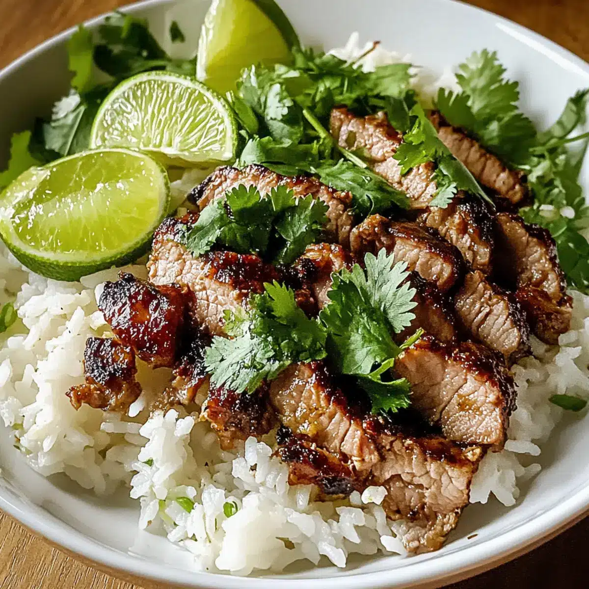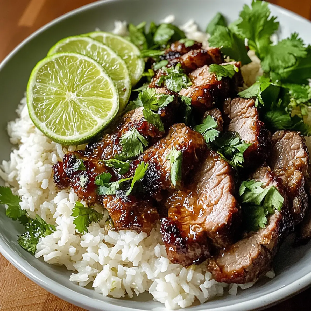 - Arrange sliced pork on top of the rice and garnish with fresh cilantro and lime wedges.