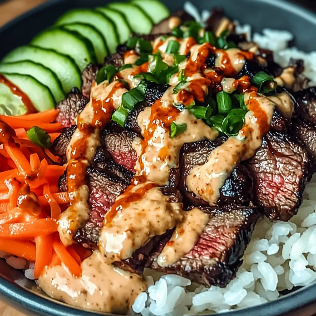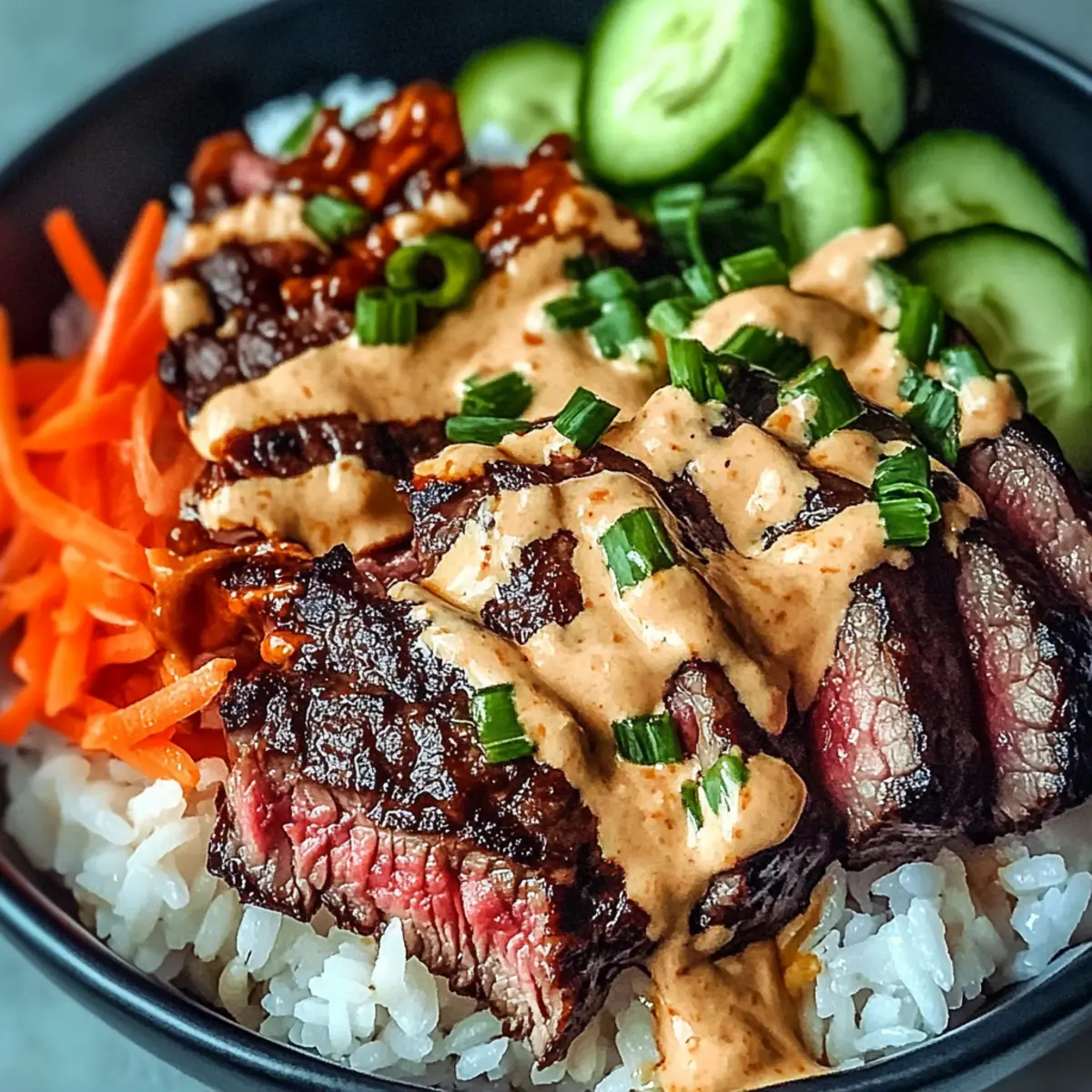 - To assemble your Korean BBQ Steak Rice Bowls, start by scooping cooked jasmine rice into individual bowls. Top the rice generously with sliced steak. Add a colorful mix of chopped green onions, shredded carrots, and sliced cucumber for crunch and freshness. Finally, drizzle the spicy cream sauce over everything, serving immediately to enjoy the delightful flavors and textures.