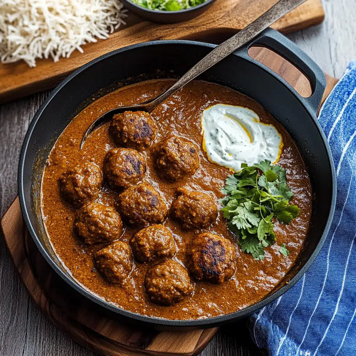 Carefully stir in the prepared mint yoghurt mixture, ensuring it becomes a part of the sauce for the Lamb Kofta Curry. Gently return the browned koftas to the pan, ensuring they are submerged in the fragrant sauce. Cover with a lid and let simmer for an additional 12–15 minutes, allowing flavors to fully meld and the koftas to cook through.