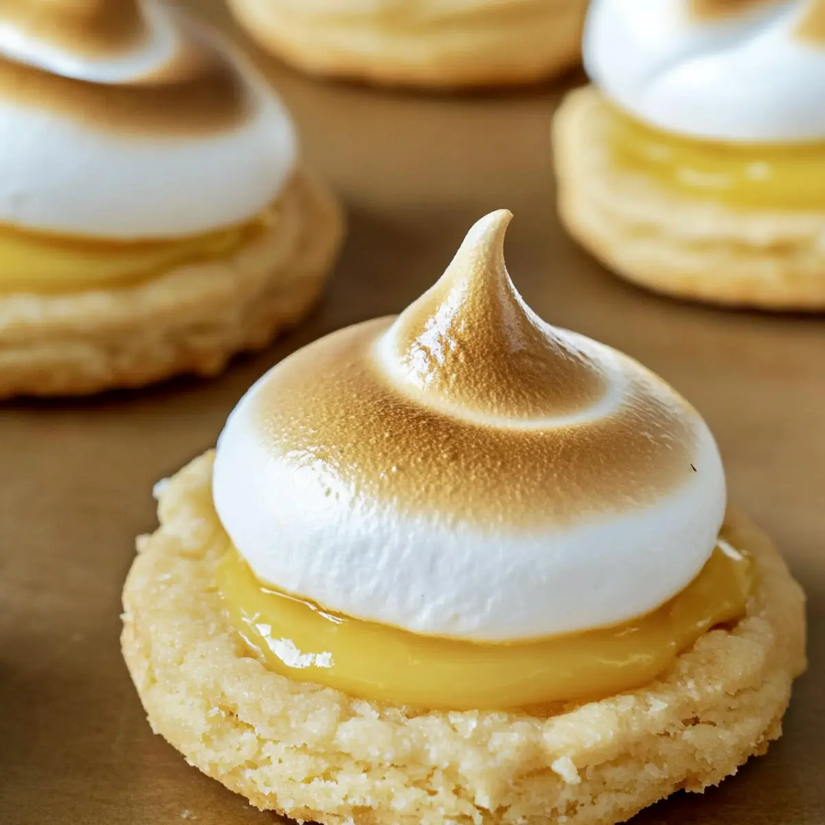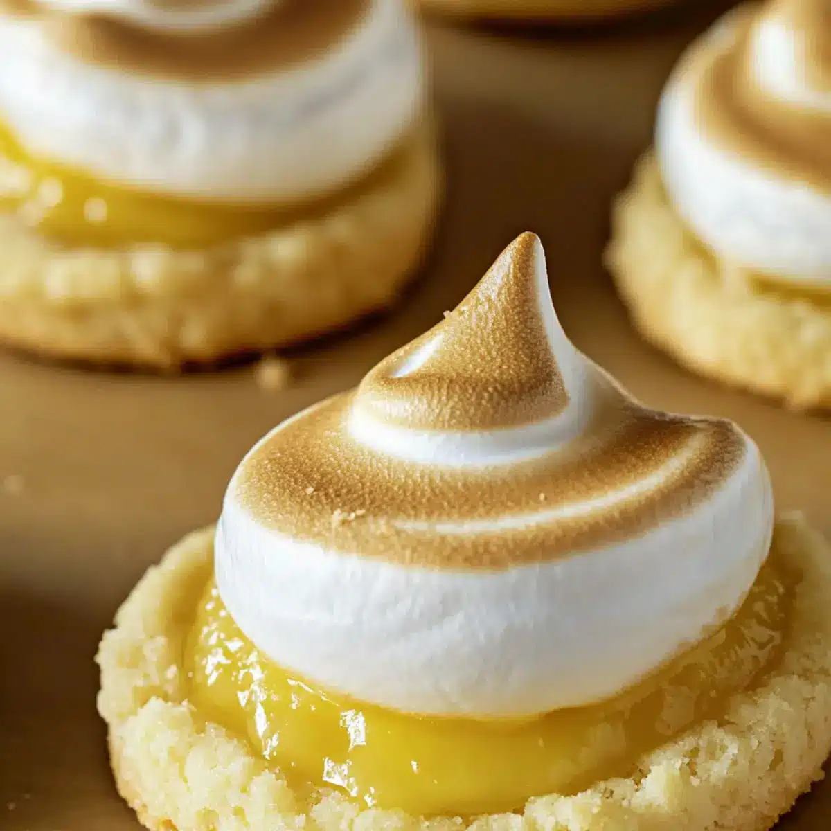 Spoon the prepared meringue over the lemon filling, creating peaks and swirls for an inviting appearance. Place the cookies back in the oven at a low temperature of 200°F (90°C) for about 10 minutes, just until the meringue is lightly browned. Keep an eye on them to prevent over-browning.