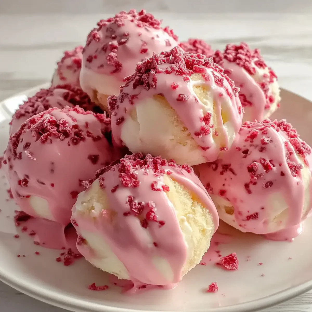 Now, while the pink coating is still wet, add a sprinkle of freeze-dried strawberries or pink sprinkles on top of each truffle for added texture and color. This step is where your creativity shines! Carefully arrange them before the coating sets to achieve a beautiful presentation.
